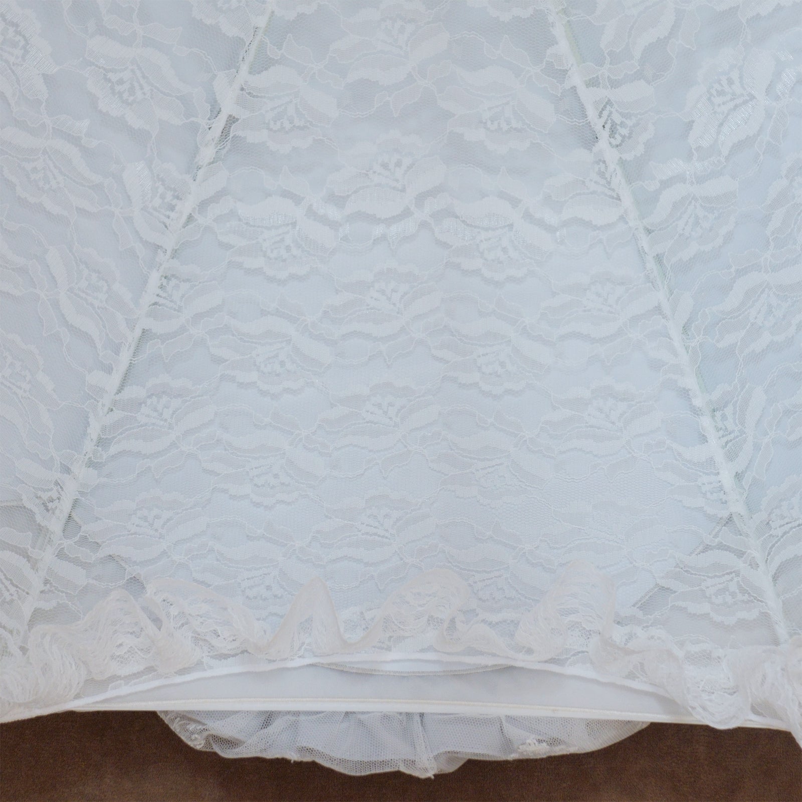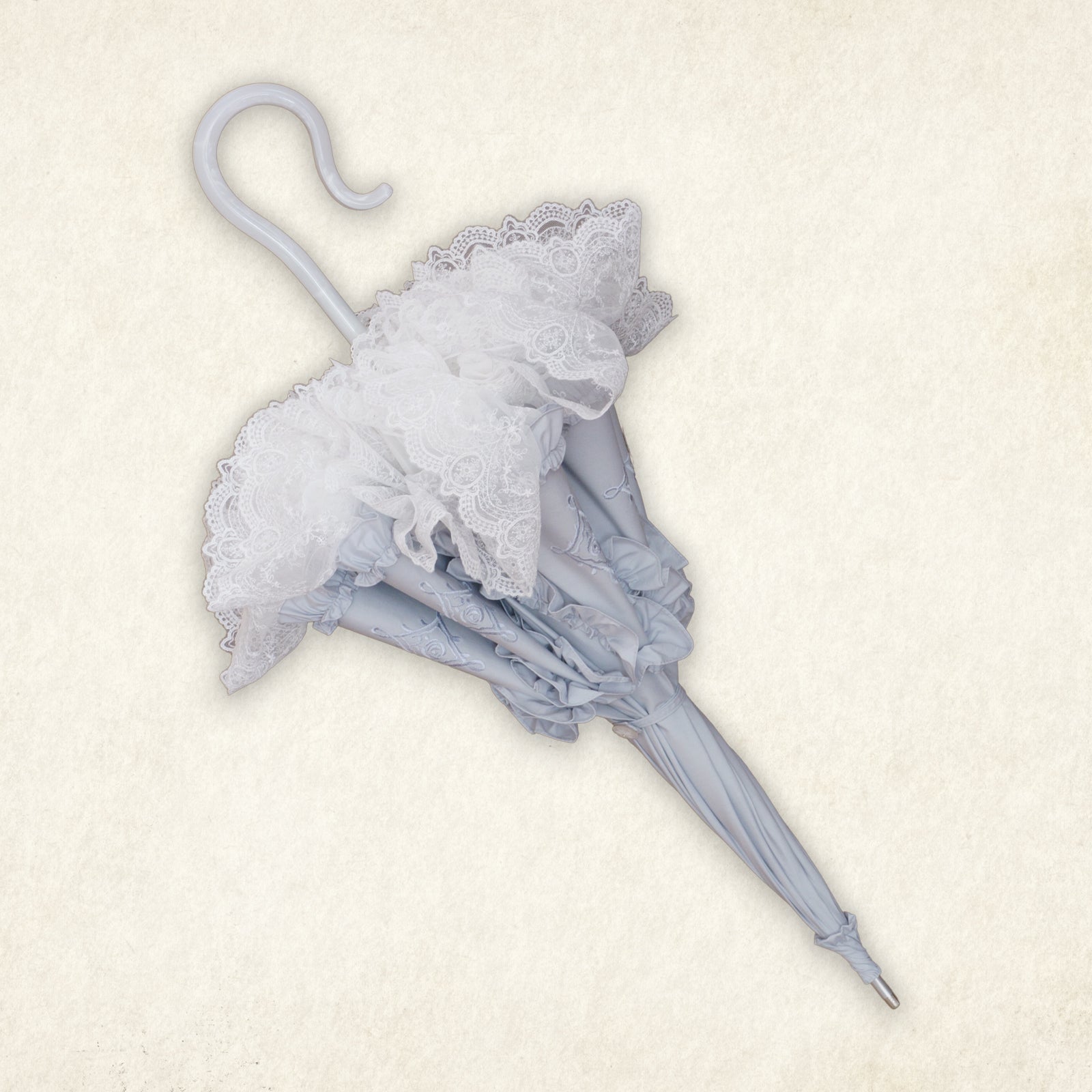 すべての表面パネルに丁寧に施されたバラモチーフ刺繍と、裏面に広がる総レースが、幻想的な表情を演出。