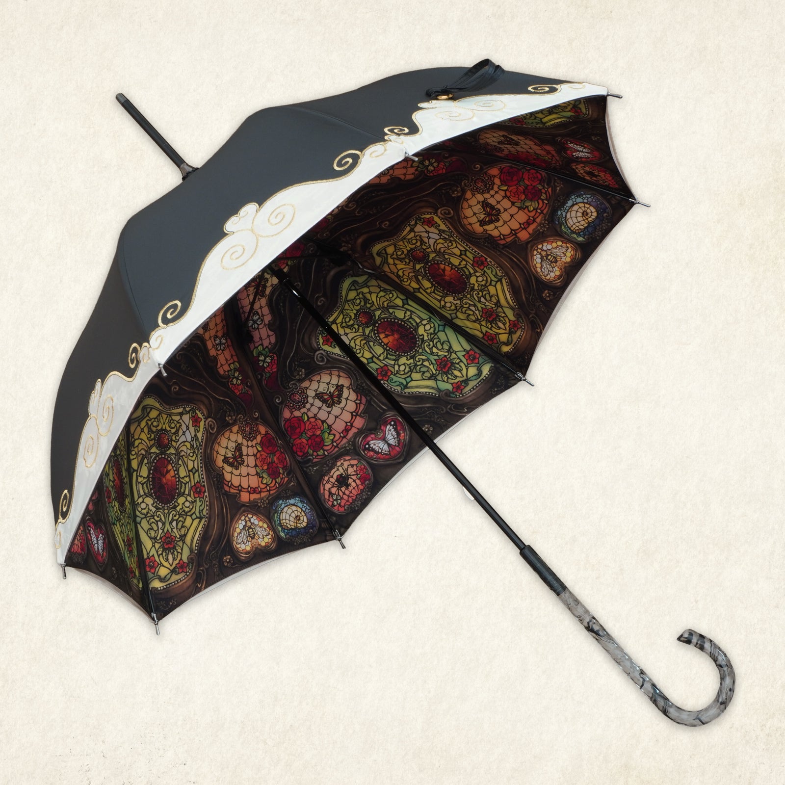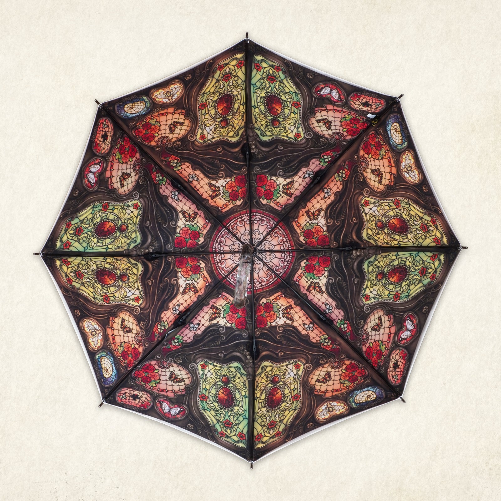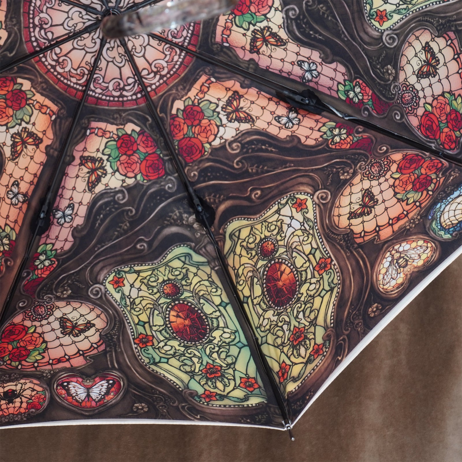 ステンドグラスのように美しく広がる繊細なイラストが、傘の内側いっぱいに幻想的な世界観を描き出します。