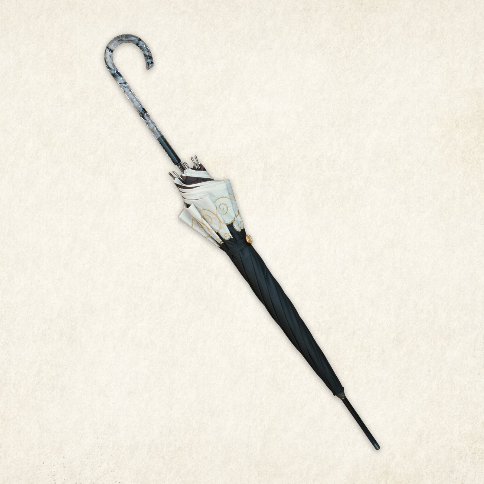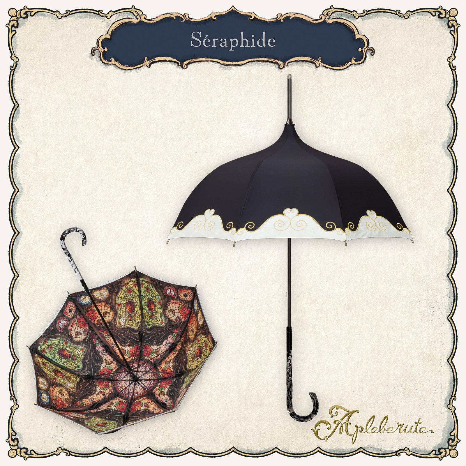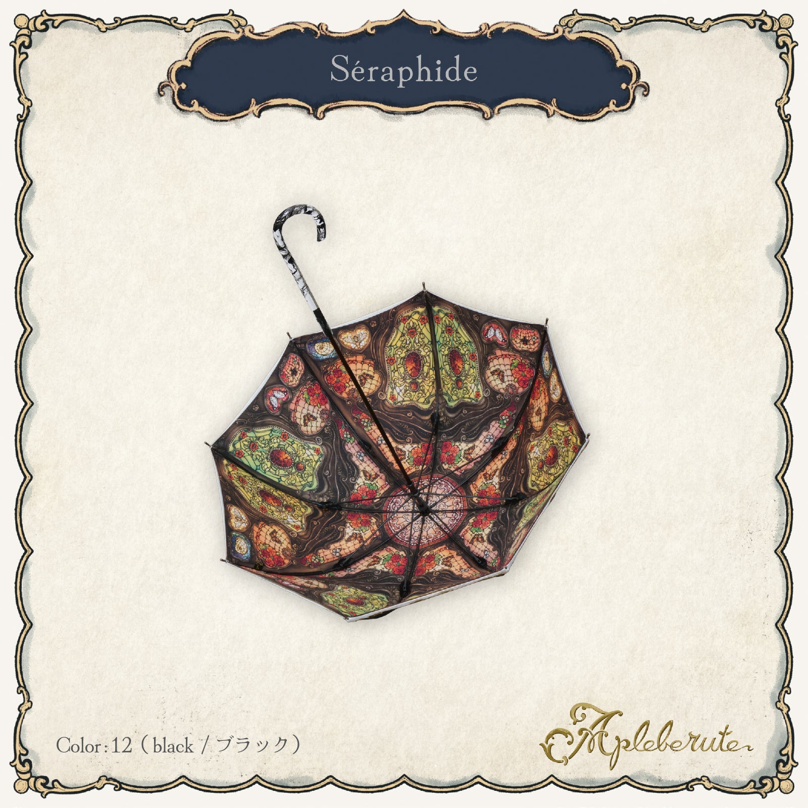 ステンドグラスのように美しく広がる繊細なイラストが、傘の内側いっぱいに幻想的な世界観を描き出します。