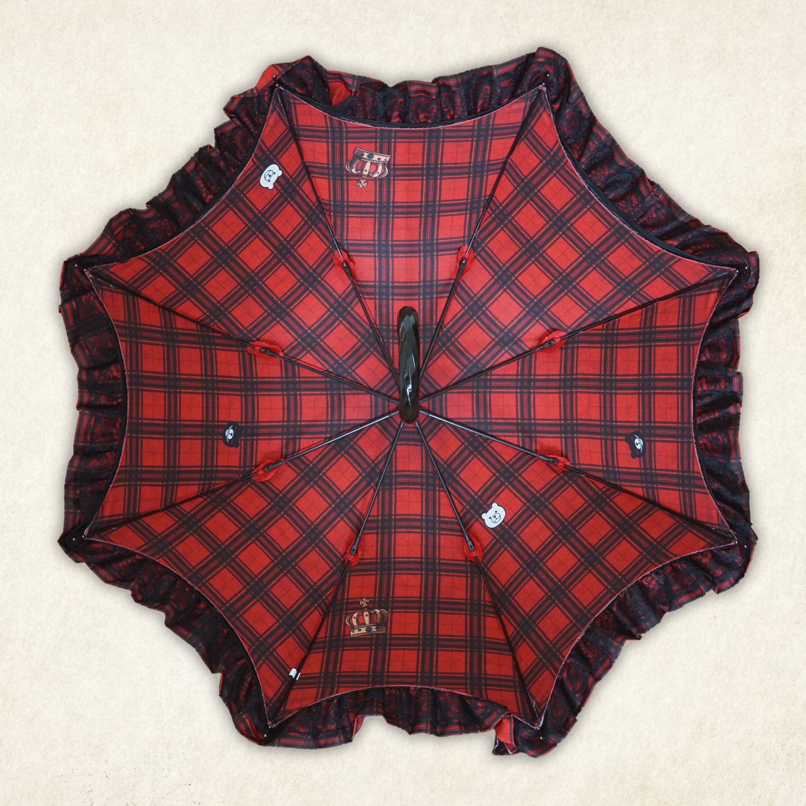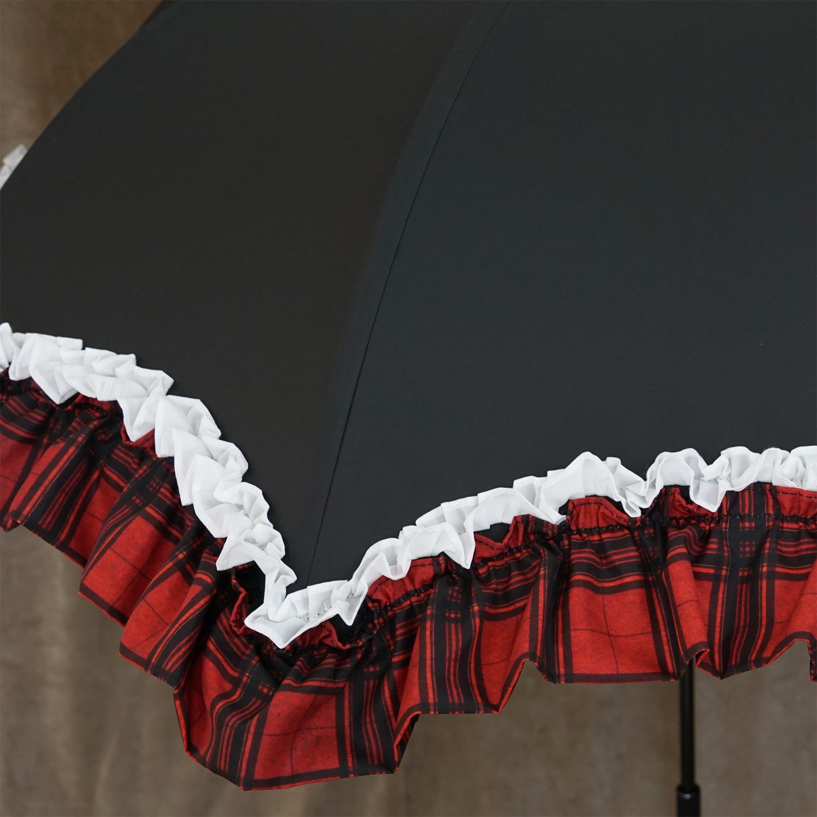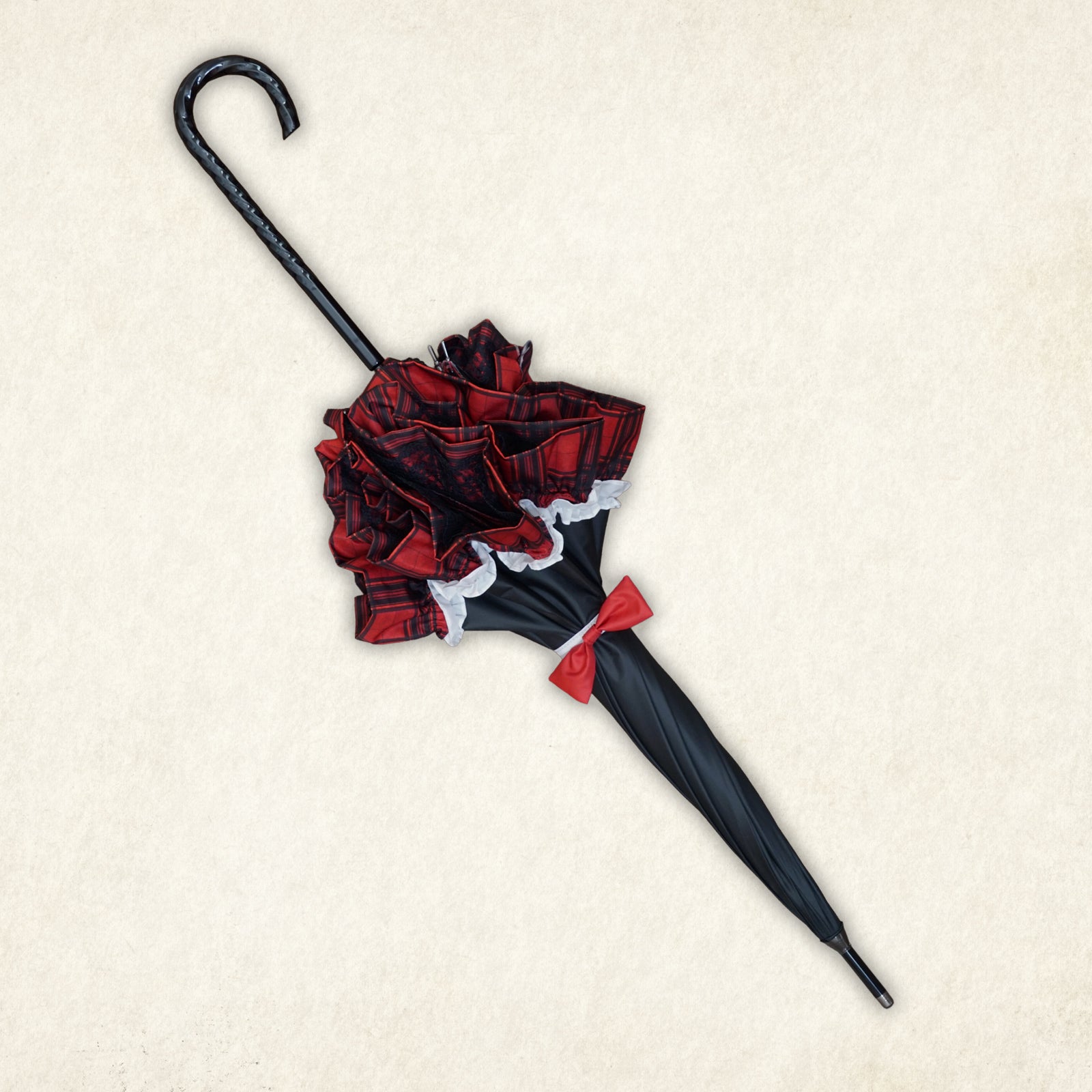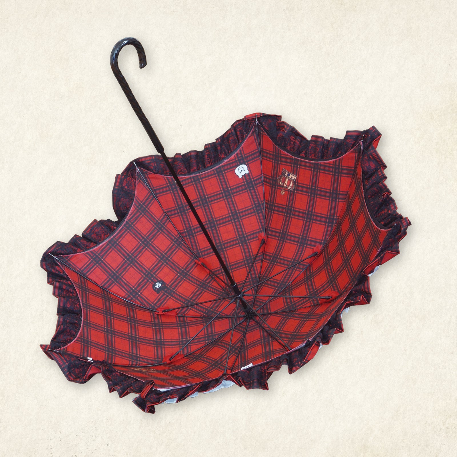 裾には赤チェックと白レースのフリルをあしらい、彼女の制服を想わせる華やかなデザイン。