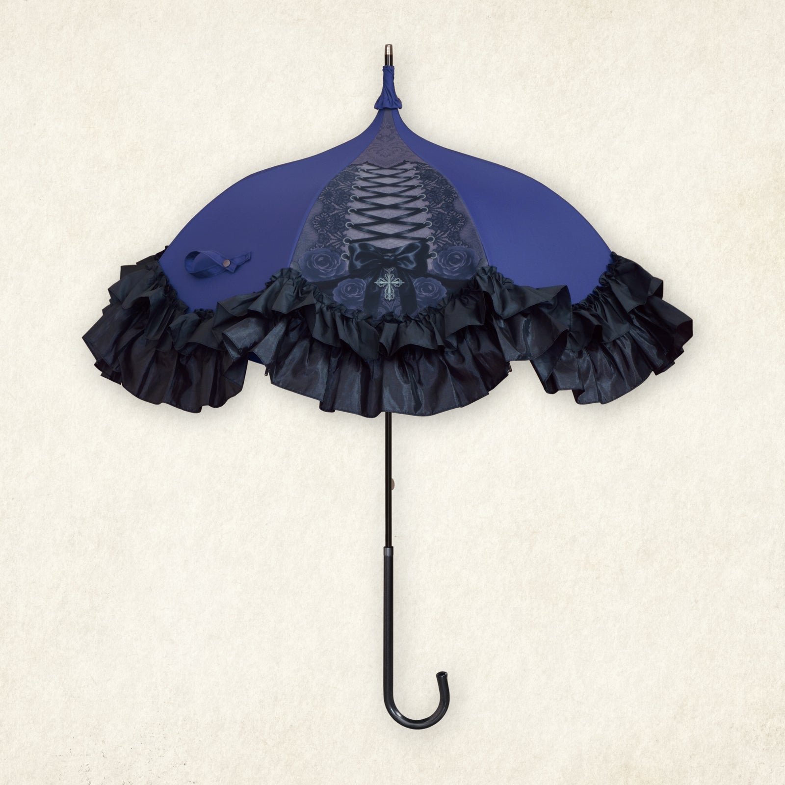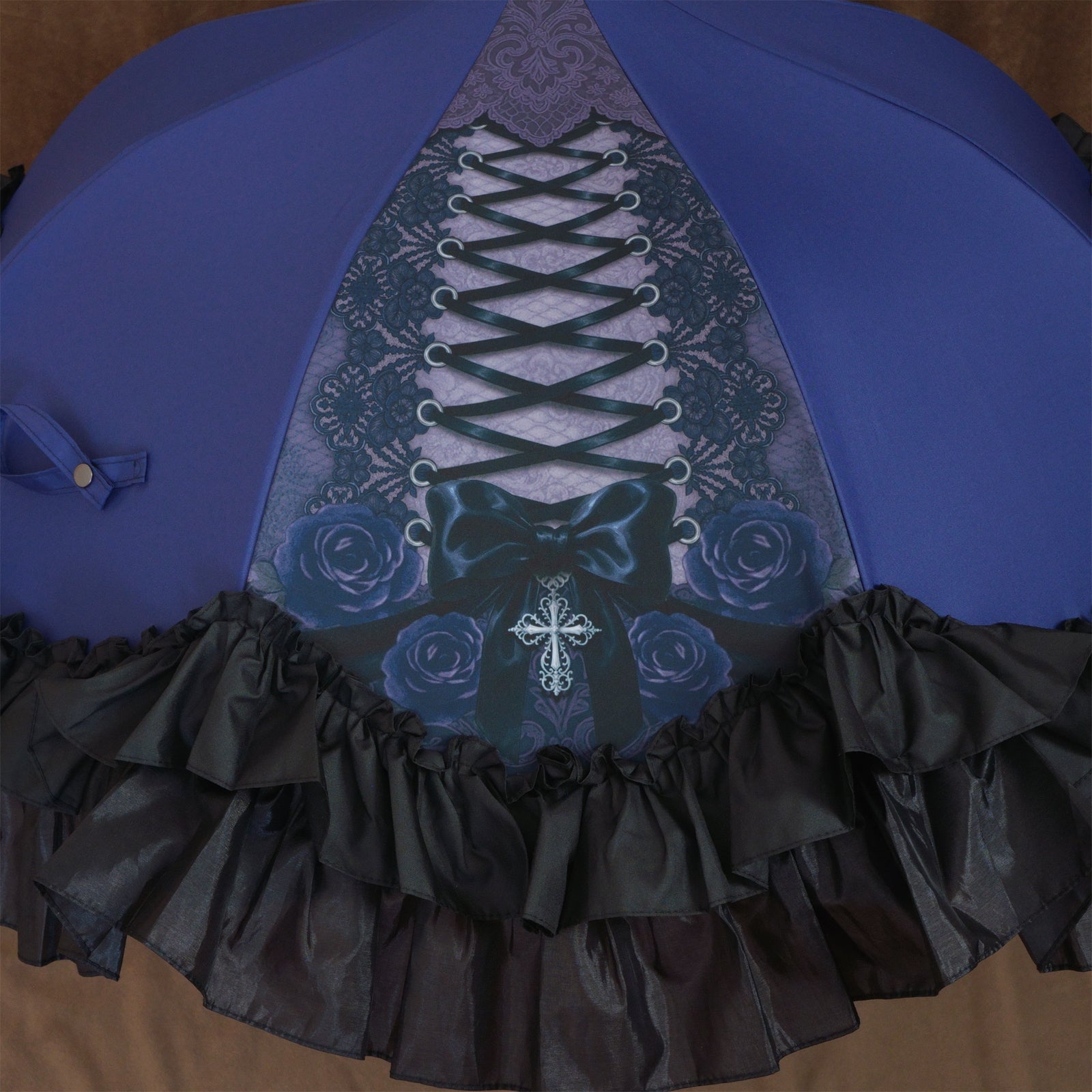 コルセット風レースアップや薔薇・クロスモチーフをインクジェットプリントで繊細に表現し、フリルが華やかさを添えます。